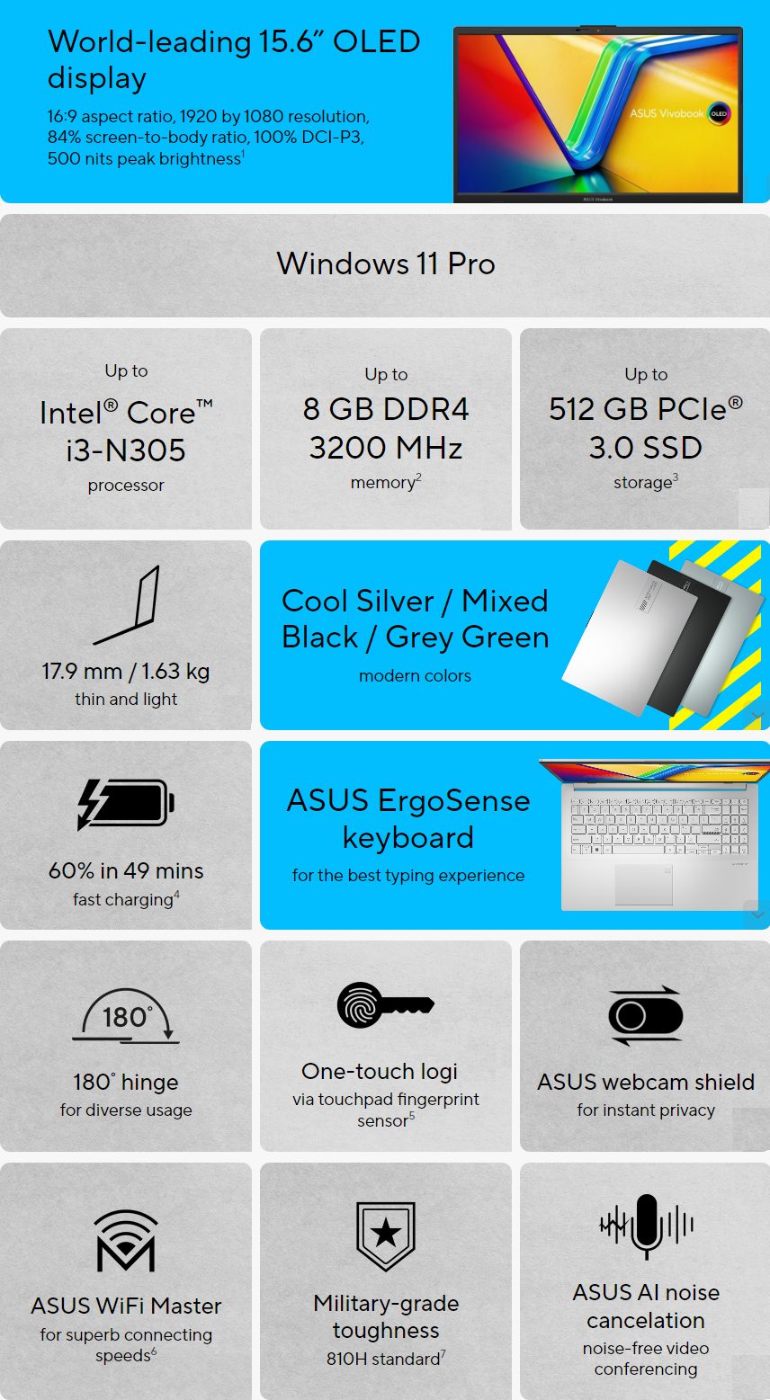 Asus ( ASUS Vivobook Go 15 E1504GA-BQ407W NB0030493 15.6" FHD Laptop (Intel Core i3-N305 DDR4 on board 8GB SSD 512GB M.2 PCIe 3.0x2 NVMe) )
