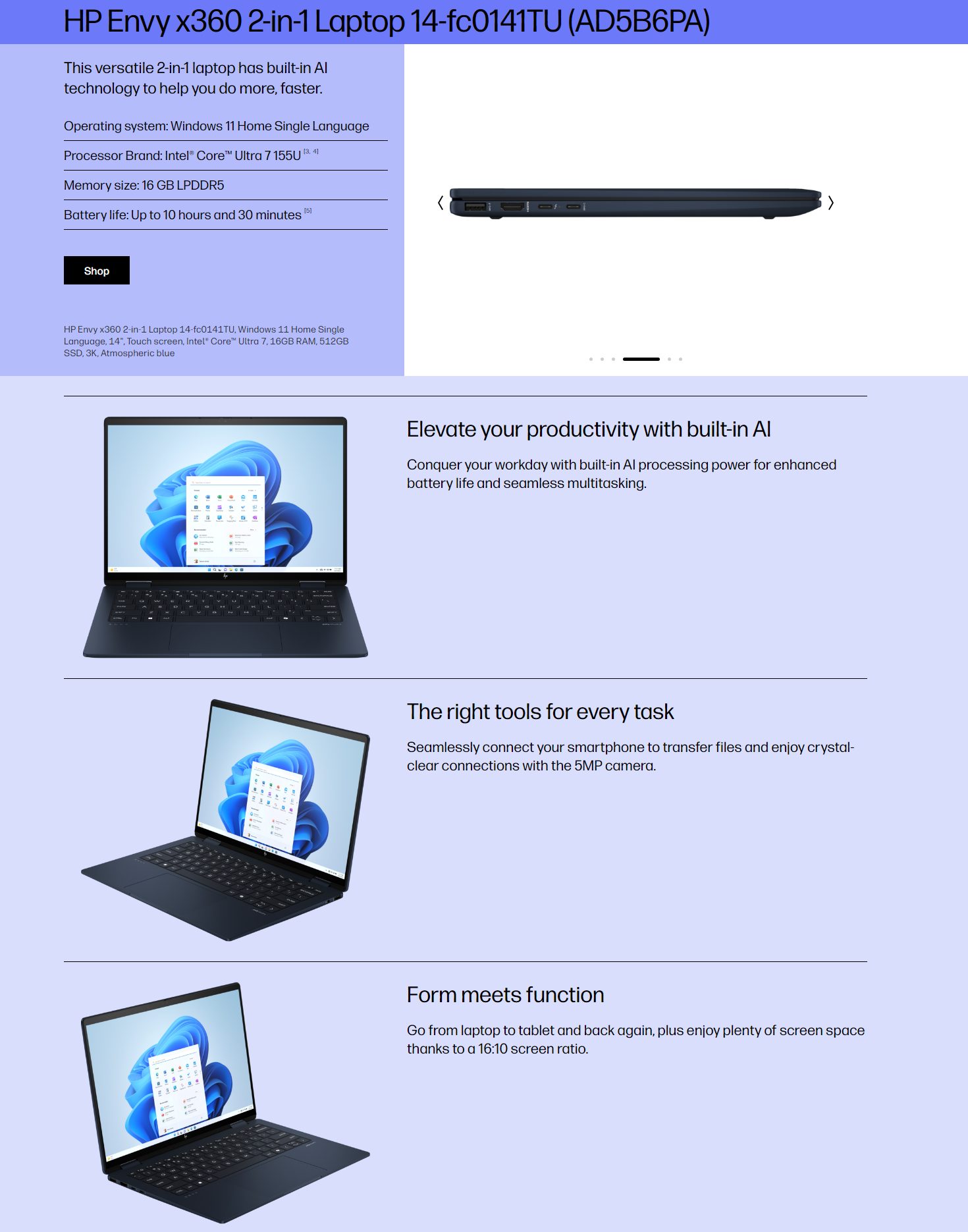 HP Envy x360 2-in-1 Laptop 14-fc0141TU (Atmospheric blue) (Intel Core Ultra 7 155U LPDDR5-6400MT/s 16GB SSD M.2 512GB PCIe NVMe)